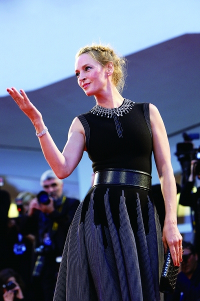 当地时间9月1日,意大利威尼斯,丹麦导演拉斯·冯·提尔争议重重的作品《女性瘾者2》(导演剪辑版)在第71届威尼斯电影节上举行首映礼。影片主演之一乌玛·瑟曼身穿复古礼服裙,向观众送上飞吻。
