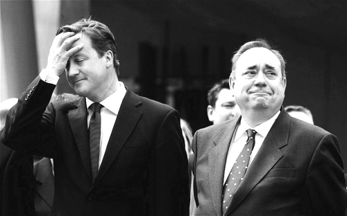 (资料图片)英国首相卡梅伦(左)与苏格兰首席部长萨尔蒙德(右)曾就独立公投举行多次会谈。 |