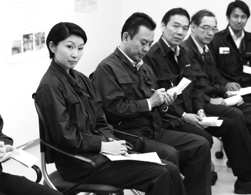 经济产业大臣小渊优子(左)是新加入安倍内阁的“女超人”。9月7日她前往福岛第一核电站参观,并向员工发表讲话。图片来源CFP |
