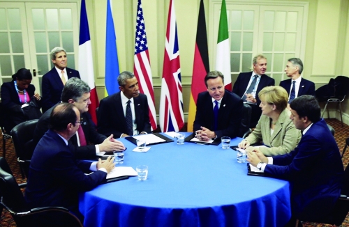 2014年9月4日,北约峰会上,各国领导人同桌会谈,探讨乌克兰局势。从左至右依次为法国总统奥朗德、乌克兰总统波罗申科、美国总统奥巴马、英国首相卡梅伦、德国总理默克尔、意大利总理伦齐。 |