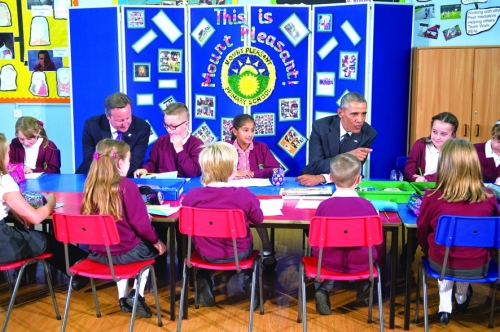 2014年9月4日,英国威尔士,英国首相戴维·卡梅伦(左)与美国总统奥巴马在会议结束后前往英国快乐山小学,与那里的学生们一起画画。 |