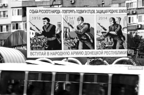顿涅茨克街头的宣传海报,借鉴了苏联时期风格。 |