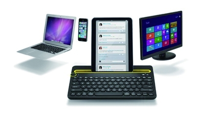 在德国柏林消费电子展上,Logitech发布了一款可多设备共用的蓝牙键盘。它能同时为不同平台和操作系统的三个电子产品充当输入设备,彼此之间的切换仅需转动键盘左上角的旋钮即可。此外,键盘上的凹槽可用来放置平板或手机,有助于节省桌面空间哦。