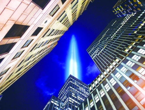 2014年9月10日,美国泽西城,天空被蓝色光束点亮,纪念9·11事件的死难者。 |