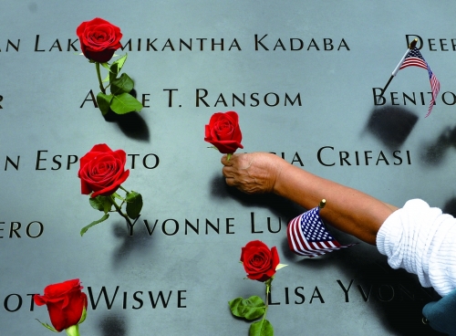2014年9月11日,美国纽约,民众在“沉思池”的遇难者名单前献花。 |