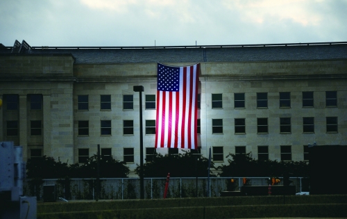2014年9月11日,美国华盛顿,五角大楼在日出时分悬挂巨型美国国旗,纪念9·11恐怖袭击发生13周年。 |