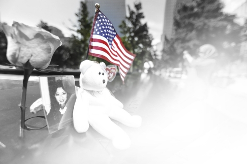 2014年9月10日,美国纽约,民众在9·11恐怖袭击事件遗址前布置鲜花、玩具、照片等物,缅怀在恐怖袭击中遇难的亲人。 |