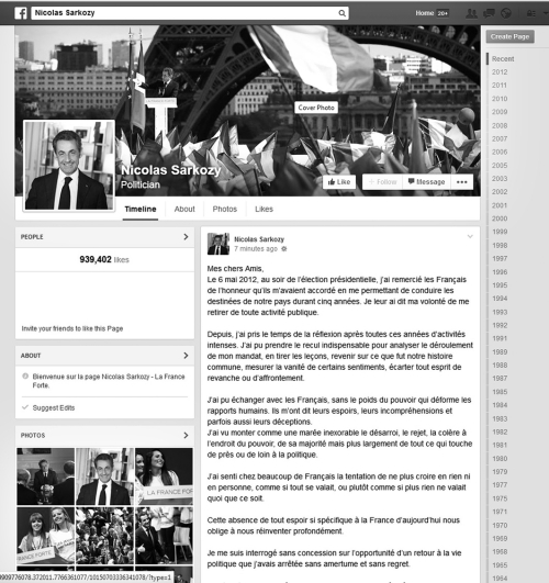 9月18日,法国前总统萨科齐在脸谱网上宣布重回政坛,将加入11月人民运动联盟(UMP)主席之位的角逐。21日,他在法国电视台第二频道接受了45分钟的访谈,向法国观众介绍“全新的萨科齐”。