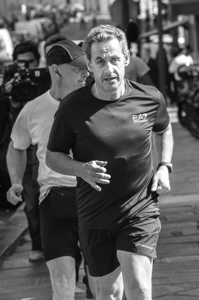 9月16日,一身运动装的萨科齐在巴黎街头慢跑。为了强调自己比竞争者更年轻,他频繁以户外运动秀精力。 |