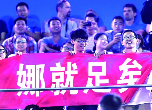 9月22日,湖北武汉,2014武汉网球公开赛第4日,现场球迷举标语支持李娜。图片来源CFP |