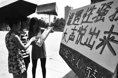 中国大学生志愿者们用行为艺术的方式宣传防狼攻略。 |