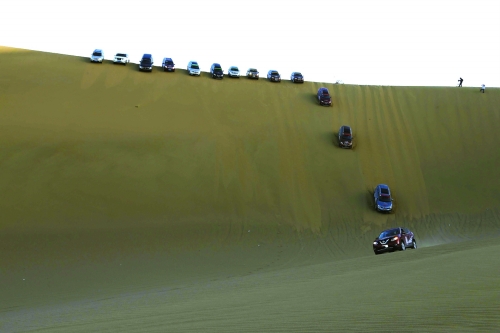得益于教练的临场指挥,避开多次即将陷车的险情后,笔者终于登顶成功——最刺激的时刻却也随之来临。不是因为登顶,而是因为这是一道沙脊——如刀锋般,冲顶的下一刻车头便已朝下,面前是一个极其陡峭的下坡。一排新奇骏就这样“挂”在坡顶,异常壮观。