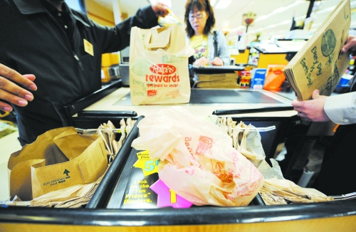 和纸袋相比,人们在购物时更喜欢用塑料袋。 |