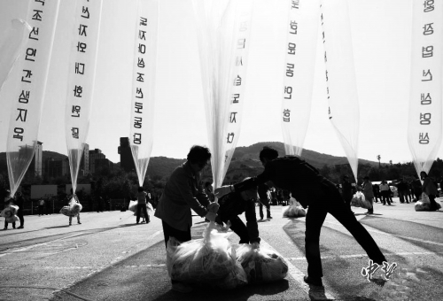 10月10日,韩国坡州,韩国一民间团体再次散发反朝传单,约两万张反朝传单随气球升空。