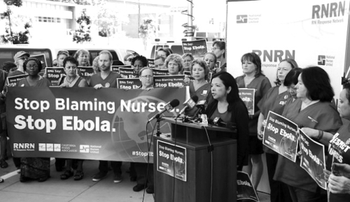 感染案例也加剧了医护人员的不满。弗里登发表“女护士因违规操作而感染”的观点后几小时,全美护士联合工会就举行了发布会。与会者高举标语“停止指责护士,停止埃博拉病毒传播”。