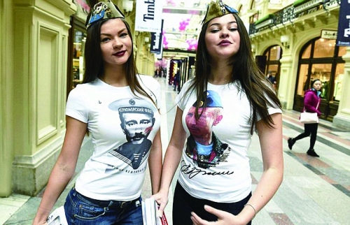 普京头像也成为这一季的热门设计元素,就差没上时装周了。莫斯科红场的一家商场从10月6日起,连续3天出售印有普京头像的T恤和运动衫,衣服上的普京有戴墨镜的、打冰球的、钓鱼的、和阿穆尔虎玩耍的……身材凹凸有致的姑娘们大方地把普京穿在身上,还毫不吝啬地在他脸上留下一枚唇印。