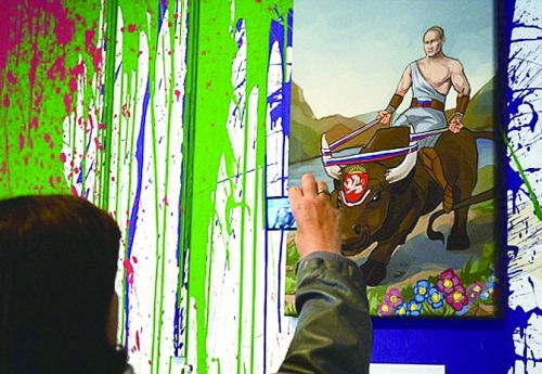 10月6日,一个名为“普京的十二伟业”的画展在莫斯科展出。12幅古希腊陶画风格的画作,把“硬汉”普京比作古希腊神话中的英雄赫拉克勒斯,宣扬他阻止美国轰炸叙利亚等12件“丰功伟绩”,将其推到了“半神”的行列。