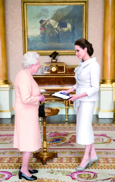 当地时间10月10日,英国女王伊丽莎白二世在白金汉宫授予好莱坞影星安吉丽娜·朱莉“杰出圣迈克尔和圣乔治荣誉爵士大十字勋章”,以表彰她在反对战争区域性暴力等方面的贡献。