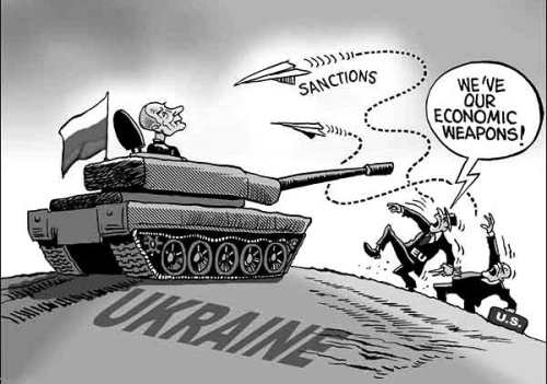 自乌克兰危机爆发后,这副漫画就在互联网上流行起来:普京坐在插有俄罗斯国旗的坦克上向乌克兰进发,而美国和欧盟只好扔出“经济制裁”的武器——纸飞机。但眼下,油价猛跌直击俄经济命脉,俄经济已受重创。 |