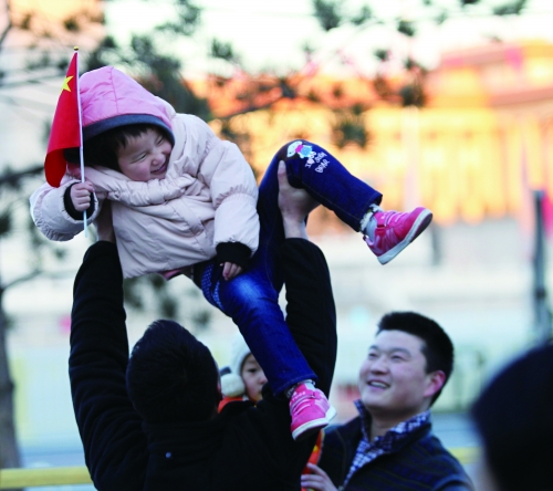 2014年3月5日清晨,来自山东青岛的4岁小朋友张莹和家人在北京天安门广场观看升国旗仪式。身为独生子女的张莹是父母眼中的焦点,更是全家人的宝贝。 |