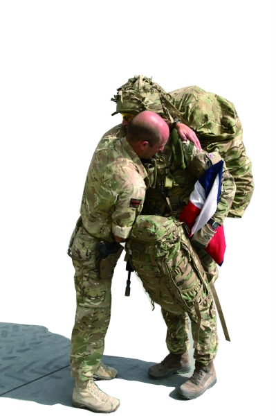 2014年10月27日,阿富汗坎大哈,两名士兵在撤离飞机抵达坎大哈后拥抱作别。 |