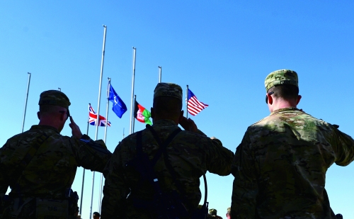 2014年10月26日,阿富汗赫尔曼德,美英部队向阿富汗军方转交军事基地的仪式上,士兵们向徐徐降下的英国、北约、阿富汗和美国旗帜敬礼。 |