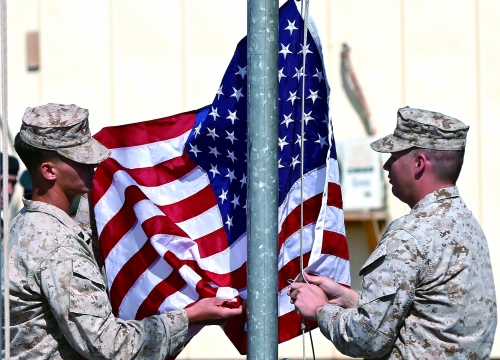 2014年10月26日,阿富汗赫尔曼德,接到命令后,美国海军陆战队举行降旗仪式,准备撤离。 |
