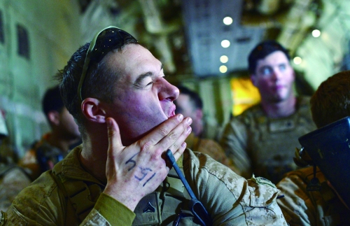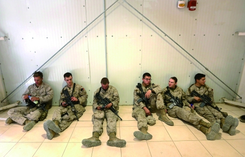 2014年10月26日,阿富汗赫尔曼德,几名美英国士兵在撤离前坐在一起休息。几个小时后,他们就将各奔东西。 |