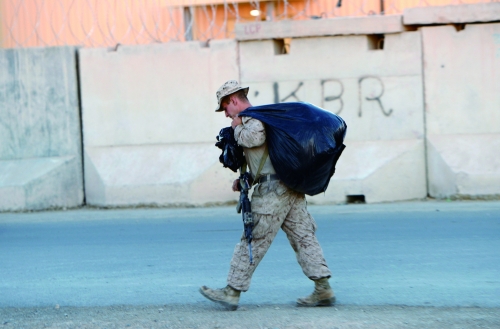 2014年10月25日,阿富汗赫尔曼德,一名美国海军陆战队队员背着行囊离开营地。 |