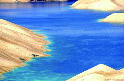 汽车继续前进,翻过一座座山峰,眼前的景色依然精彩地变化着。突然,在经过一片如同沙漠般的景观后,眼前出现了湛蓝色的湖水。或许,这片蓝得如梦似幻的水面,并不足以让人惊诧,但它偏偏出现在一片白黄的自然地貌间,远远望去,像极了柔软的沙子慢慢渗入湖水,我几乎无法相信自己的眼睛,如此的风光,着实震撼人心。