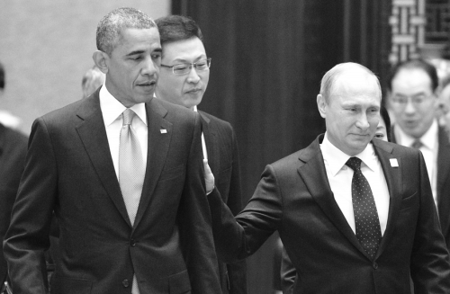 11月11日,北京,俄罗斯总统普京和美国总统奥巴马进行短暂交流。此前,俄罗斯总统发言人德米特里 佩斯科夫表示,俄罗斯总统普京和美国总统奥巴马10日在APEC峰会上只是互相向打了招呼,并没有进行任何交谈。