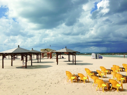 特拉维夫的海滨浴场整洁得像个文静的姑娘,细软白净的沙滩从棕榈树下直铺到海边,一排排黄色的沙滩椅惬意地躺在沙滩上,几个木头搭建的凉亭随意地晒着阳光,阵阵海浪悠闲地在岸边荡漾。被誉为地中海最美的海滨,这里当之无愧。