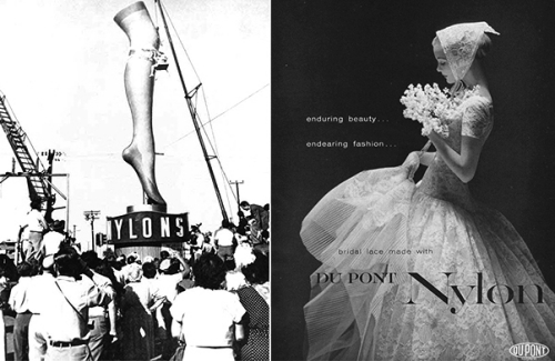 物资紧缺的二战期间,哪种长袜都很难弄到,结果出现了以下两种情况:女人们在各自的腿上“化妆”(参见斯特拉·吉本的《韦斯特伍德》),用颜料描出长袜缝合线的样子充数;另外,美国大兵有权弄到尼龙长袜,经常用它勾引欧洲女孩。在罗杰·巴克斯的恐怖小说《谋杀计划》里,一个年轻女性这样说起新交的男朋友:“是他给我这些尼龙长袜的。”