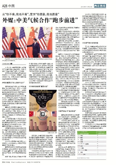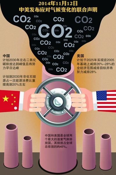 中美两国11月12日在北京发表了气候变化联合声明,其中包含两国各自在2020年后应对气候变化的行动目标。 |