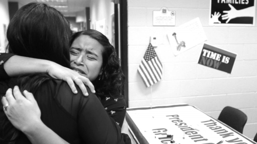 11月20日,劳拉·莫雷诺在爱达荷州南帕市的西班牙文化中心听完奥巴马的演讲后,与好友克里斯塔拥抱在一起。莫雷诺9岁时以非法身份和母亲来到美国。 |