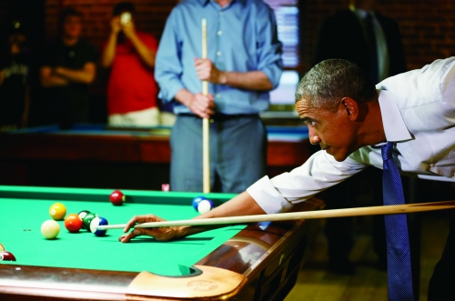 2014年7月8日,美国丹佛,奥巴马访问丹佛为参议员Mark Udall竞选募款。活动间歇,奥巴马前往当地一家小酒馆,与随行人员打起桌球。 |