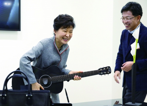 2014年11月24日,韩国全罗北道全州市,韩国总统朴槿惠出席“创造经济革新中心”揭牌仪式,并视察该中心。图为朴槿惠在视察中试弹用碳纤维材料制作的吉他。 |