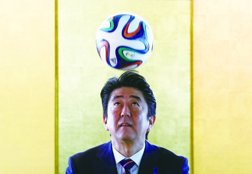 2014年8月1日,巴西首都巴西利亚,正在中南美洲进行访问的日本首相安倍晋三抵达此行的最后一站巴西。图为安倍收到巴西足球天王济科签名的足球后,头顶足球“炫技”。 |
