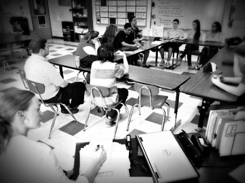 詹妮·威灵顿的学生坐成一圈讨论,她在旁边做笔记。 |