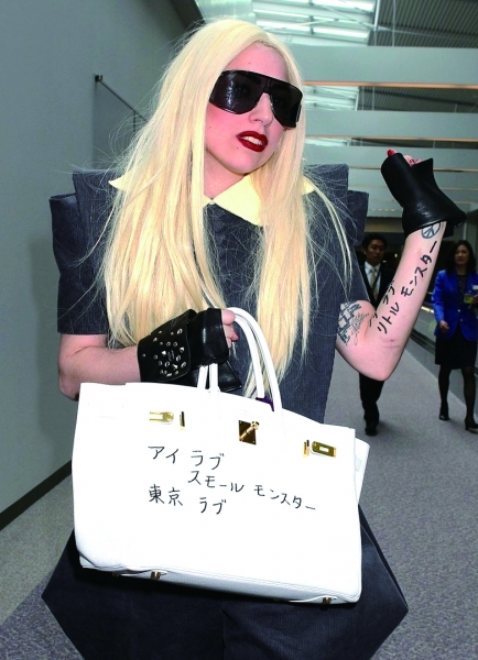 时尚界的另一话题女王——Lady Gaga当然不会错过“糟蹋铂金包”这种昂贵的小把戏。2010年去日本时,她用黑色马克笔在崭新的白色铂金包上写下“我爱小怪兽,东京爱情故事”的日文字样,并让粉丝在包的背面随意涂写。