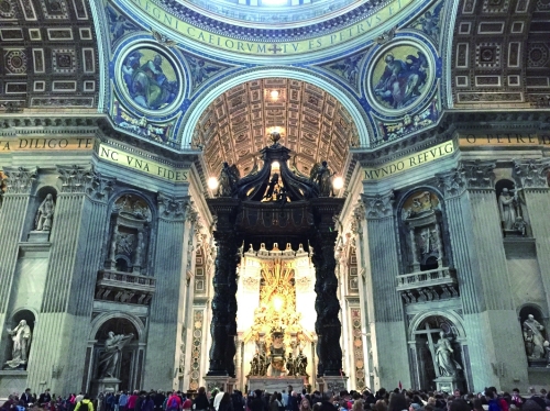 圣彼得大教堂,自然而然地成为全世界巴西利卡之首,既是因为其地位和建筑本身,也是因为其内部遗存。进入大教堂,右手边即是米开朗琪罗的杰作《圣母怜子像》,这是其1499年的雕塑作品,当年米开朗琪罗25岁。初进教堂,我只是随着人流向右涌动,在这座雕塑前聚集了大量的游人,挤过去看到说明牌才知是大师的作品。雕塑中的圣母显得太过年轻,儿子又太过瘦小,据说是艺术家为了突出艺术效果而刻意为之。