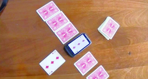 魔术师从一摞洗好的扑克牌中拿出6张摆在桌子上,请观众随机选取其中一张挪开,把手机放在此牌刚才的位置上,打开Phoney,屏幕闪过一段电波后,出现了方片3的牌面,而翻开那张挪走的牌,正是方片3,很不可思议吧!