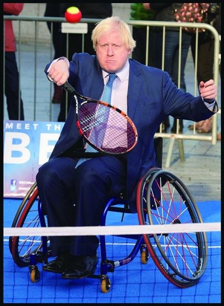 当地时间11月24日,英国伦敦,伦敦市长鲍里斯·约翰逊亲自上阵,打“轮椅网球”,为即将到来的轮椅网球赛预热。