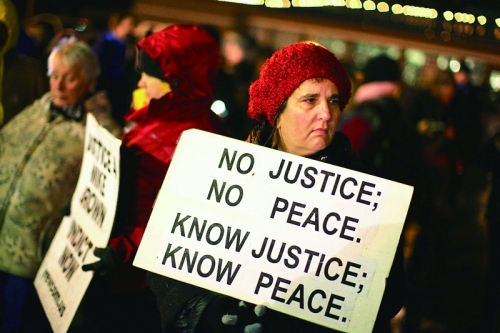 当地时间11月21日,美国密苏里州弗格森市,民众抗议美国白人警察枪击非裔青年案。密苏里州大陪审团24日作出决定,枪杀非洲裔青年布朗的白人警察威尔逊合法使用武器,免于被起诉。