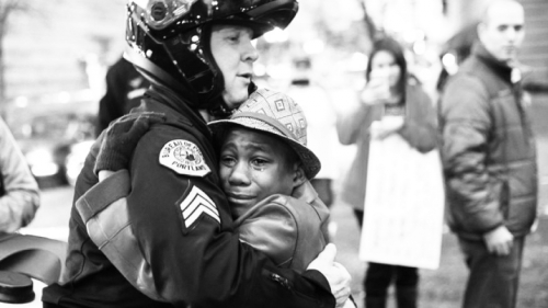 抗议声中也有温情的一幕发生。近日美国社交媒体疯传一张头戴钢盔的白人警察与黑人男孩紧紧相拥的照片。在波特兰的示威活动中,12岁黑人男孩德温特·哈特举着写有“免费拥抱”的纸牌,流着眼泪,这一幕被白人警察鲍纳姆看到,他招手让哈特上前,将他抱入怀中。 |