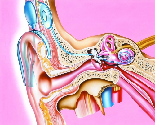 用于外耳及内耳的人工听力设备:架在外耳背后的麦克风通过金属线将声音传送到耳蜗中植入的电极里。电极用电脉冲的形式将声音传送到听觉神经和大脑,使失聪者听到声音。 |