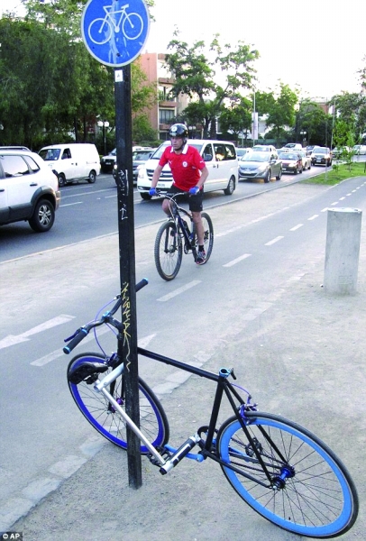 据美国雅虎新闻网报道,智利三名大学生最近发明了一款名为“尤科”的防盗自行车,别看它不带锁,却可以牢牢固定在树上或路灯杆上。