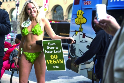 当地时间12月1日,美国首都华盛顿,善待动物组织成员穿着生菜制成的比基尼在街头宣传素食,向路人发放素三明治。 |
