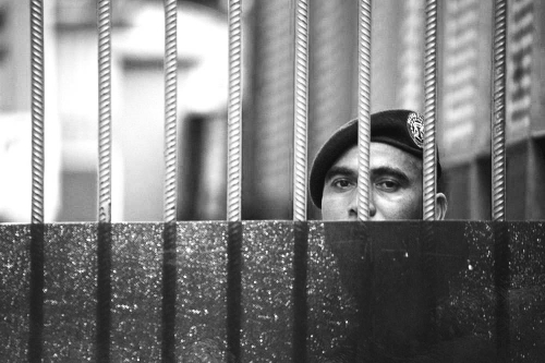 联合国难民署设在马来西亚吉隆坡的办事处内,警卫注视着门外排队申请难民证的人。 |
