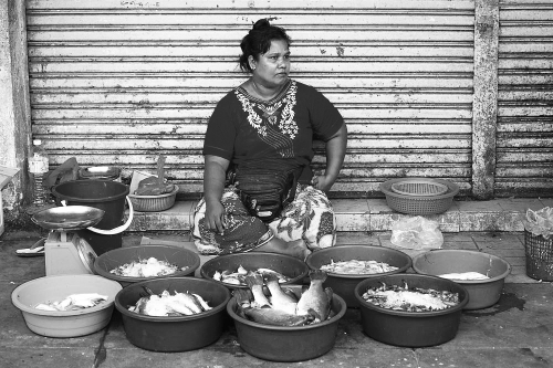一位难民在马来西亚吉隆坡街头摆摊卖鱼 |